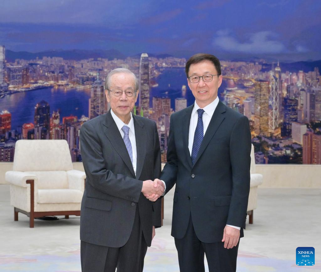 Chinese Vice President Han Zheng meets with former Japanese Prime Minister Yasuo Fukuda in Beijing, capital of China, Oct. 25, 2023. (Xinhua/Gao Jie)
