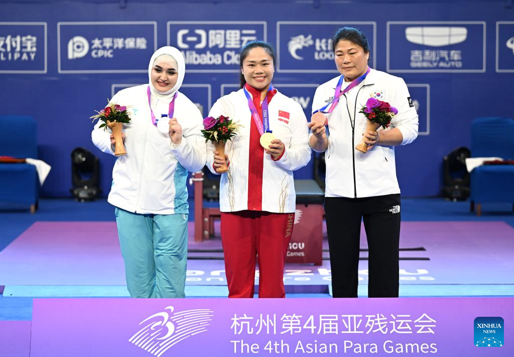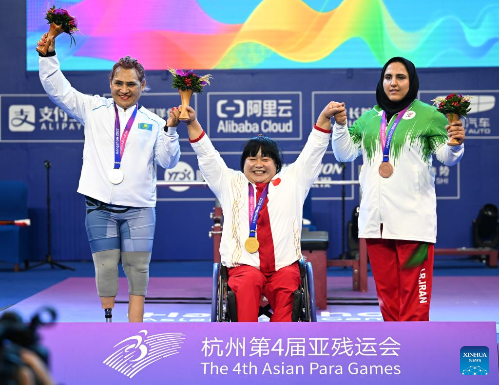 Gold medalist Xu Lili (C) of China celebrates with silver medalist Raushan Koishibayeva (L) of Kazakhstan and bronze medalist Zahra Aghaeisamani of Iran during the awarding ceremony of the Women's 73kg event of the Powerlifting at the 4th Asian Para Games in Hangzhou, east China's Zhejiang Province, Oct. 26, 2023. (Xinhua/Bei He)