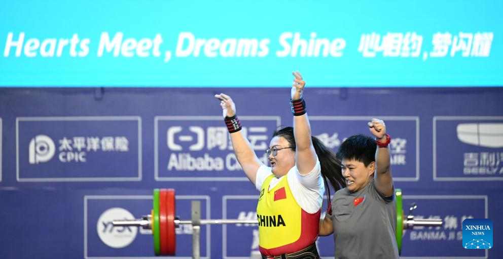 Gold medalist Han Miaoyu (L) of China celebrates during the Women's 79kg Final of the Powerlifting at the 4th Asian Para Games in Hangzhou, east China's Zhejiang Province, Oct. 26, 2023. (Xinhua/Bei He)