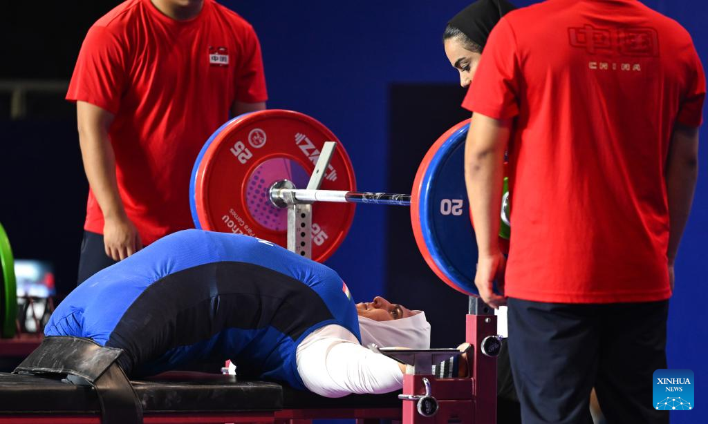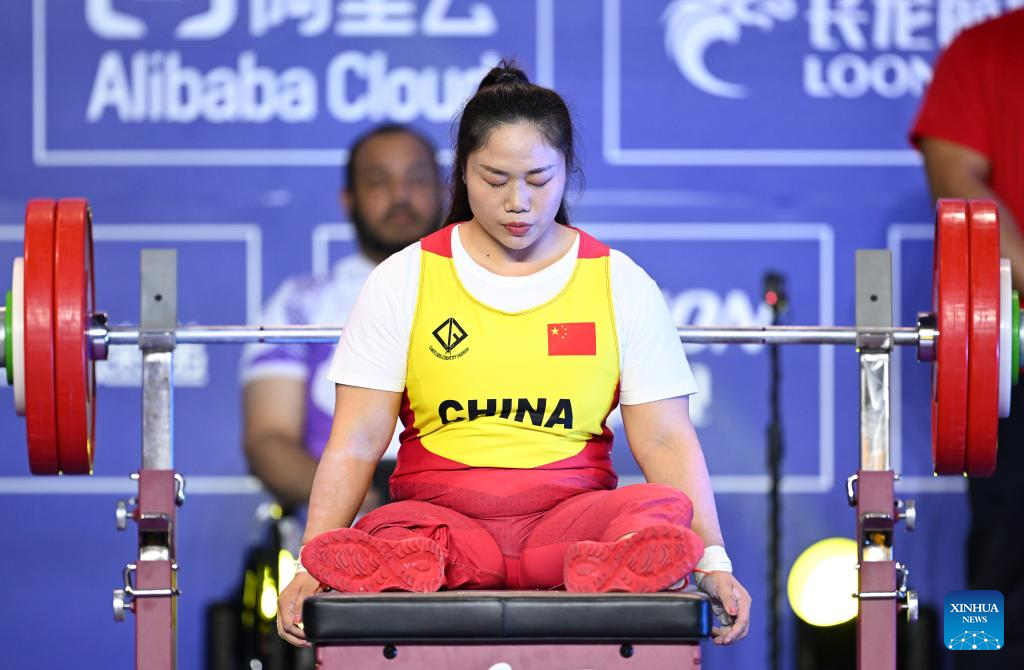 Gold medalist Xu Lili of China competes during the Women's 73kg Final of the Powerlifting at the 4th Asian Para Games in Hangzhou, east China's Zhejiang Province, Oct. 26, 2023. (Xinhua/Bei He)
