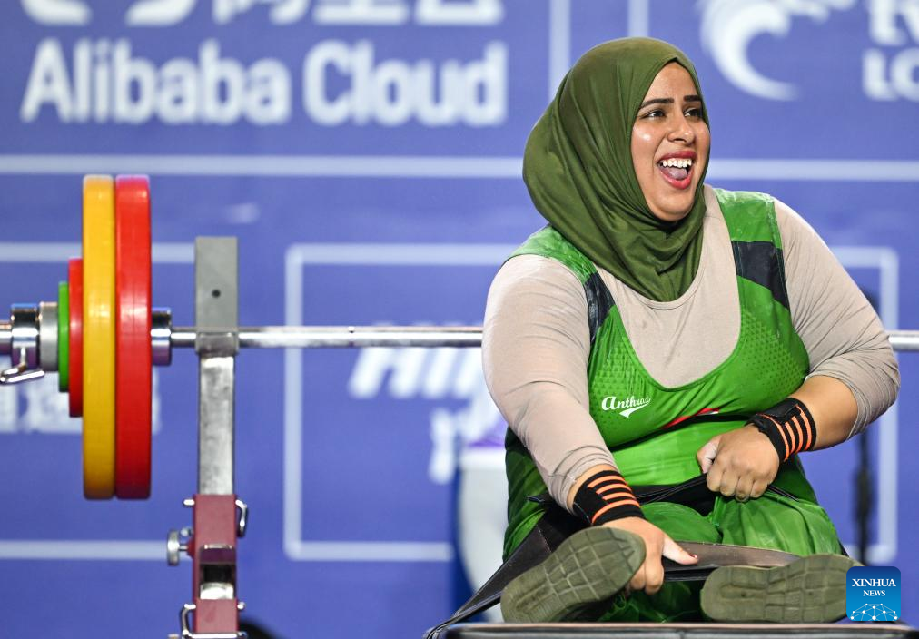Bronze medalist Zahra Aghaeisamani of Iran competes during the Women's 73kg Final of the Powerlifting at the 4th Asian Para Games in Hangzhou, east China's Zhejiang Province, Oct. 26, 2023. (Xinhua/Bei He)