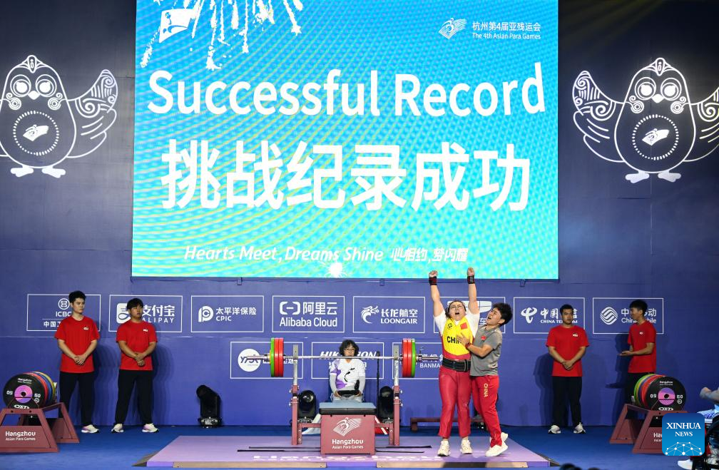 Gold medalist Tan Yujiao (L) of China reacts after setting a new world record during the Women's 67kg Final of the Powerlifting at the 4th Asian Para Games in Hangzhou, east China's Zhejiang Province, Oct. 26, 2023. (Xinhua/Bei He)