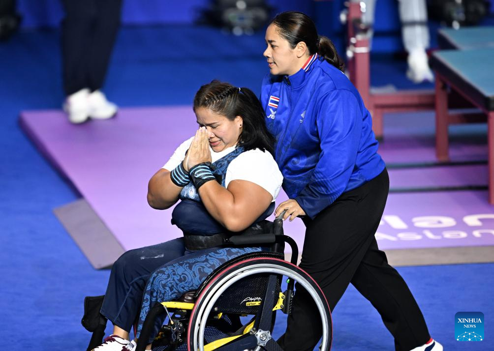 Fourth placed Arawan Bootpo (L) of Thailand reacts after the Women's 73kg Final of the Powerlifting at the 4th Asian Para Games in Hangzhou, east China's Zhejiang Province, Oct. 26, 2023. (Xinhua/Bei He)