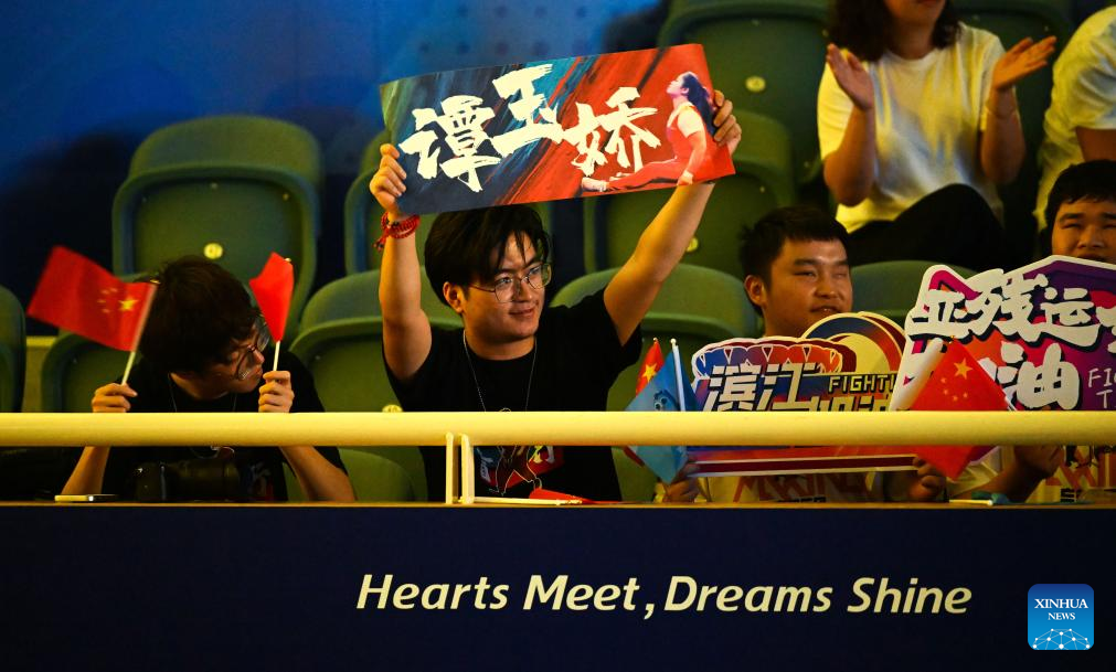 Supporters cheer for Tan Yujiao of China during the Women's 67kg Final of the Powerlifting at the 4th Asian Para Games in Hangzhou, east China's Zhejiang Province, Oct. 26, 2023. (Xinhua/Bei He)