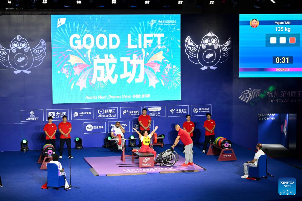 Gold medalist Tan Yujiao (front C) of China reacts after a good lift during the Women's 67kg Final of the Powerlifting at the 4th Asian Para Games in Hangzhou, east China's Zhejiang Province, Oct. 26, 2023. (Xinhua/Bei He)