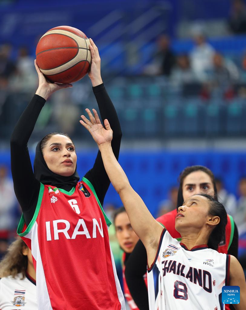 Mahsa Saadatzeinadanloo (L) of Iran shoots during the Women's Bronze Medal Match of the Wheelchair Basketball between Iran and Thailand at the 4th Asian Para Games in Hangzhou, east China's Zhejiang Province, Oct. 26, 2023. (Xinhua/Yang Zhisen)