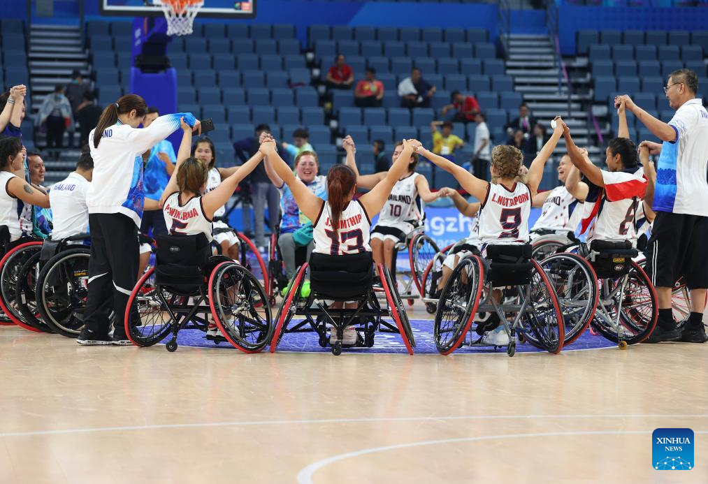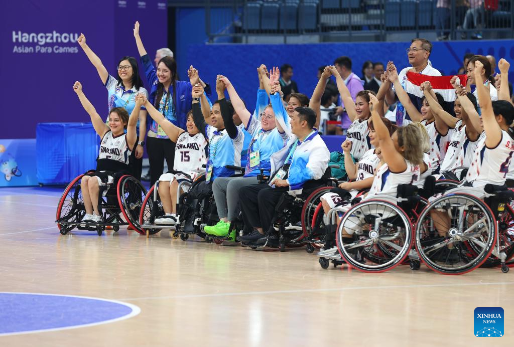 Members of Thailand celebrate after winning the Women's Bronze Medal Match of the Wheelchair Basketball between Iran and Thailand at the 4th Asian Para Games in Hangzhou, east China's Zhejiang Province, Oct. 26, 2023. (Xinhua/Yang Zhisen)