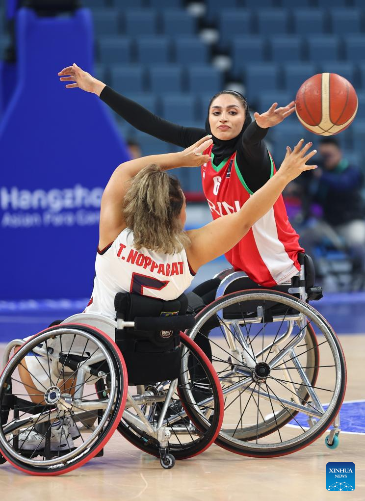 Mahsa Saadatzeinadanloo (R) of Iran vies against Nopparat Tanbut of Thailand during the Women's Bronze Medal Match of the Wheelchair Basketball between Iran and Thailand at the 4th Asian Para Games in Hangzhou, east China's Zhejiang Province, Oct. 26, 2023. (Xinhua/Yang Zhisen)