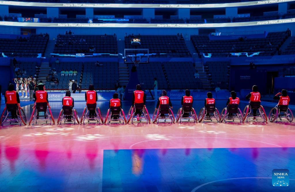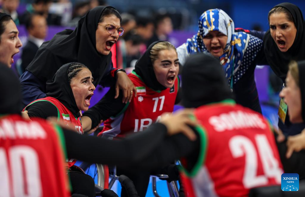 Members of Iran cheer before the Women's Bronze Medal Match of the Wheelchair Basketball between Iran and Thailand at the 4th Asian Para Games in Hangzhou, east China's Zhejiang Province, Oct. 26, 2023. (Xinhua/Yang Zhisen)