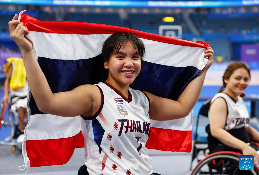 Warisa Thamlaaied of Thailand celebrates after winning the Women's Bronze Medal Match of the Wheelchair Basketball between Iran and Thailand at the 4th Asian Para Games in Hangzhou, east China's Zhejiang Province, Oct. 26, 2023. (Xinhua/Yang Zhisen)