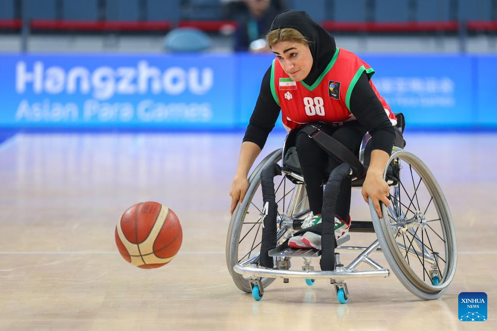 Neda Balouchi of Iran competes during the Women's Bronze Medal Match of the Wheelchair Basketball between Iran and Thailand at the 4th Asian Para Games in Hangzhou, east China's Zhejiang Province, Oct. 26, 2023. (Xinhua/Yang Zhisen)