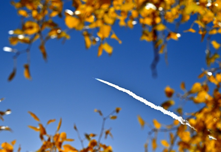 The Shenzhou-17 manned spaceship, atop a Long March-2F carrier rocket, blasts off from the Jiuquan Satellite Launch Center in northwest China on Oct. 26, 2023. (Xinhua/Ren Junchuan)