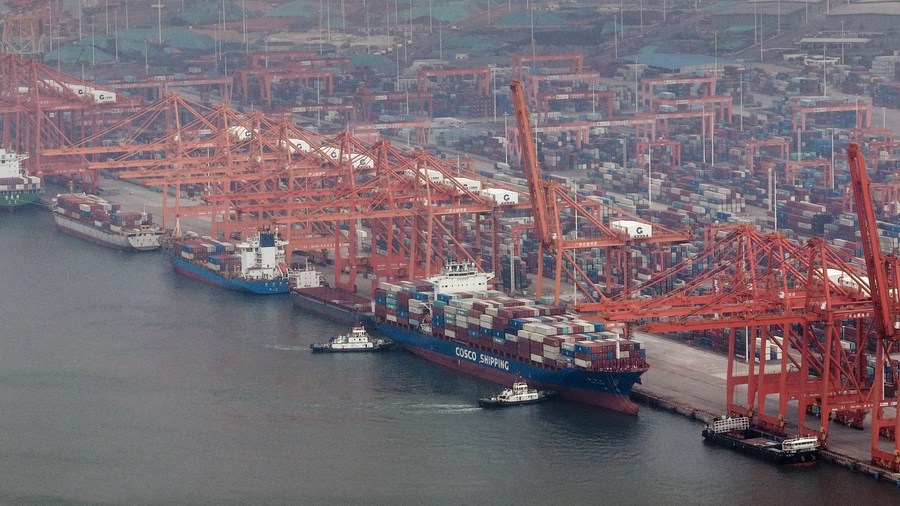 This aerial photo taken on Oct. 26, 2023 shows a container terminal at the Qinzhou Port in Qinzhou City, south China's Guangxi Zhuang Autonomous Region. (Xinhua/Zhang Ailin)