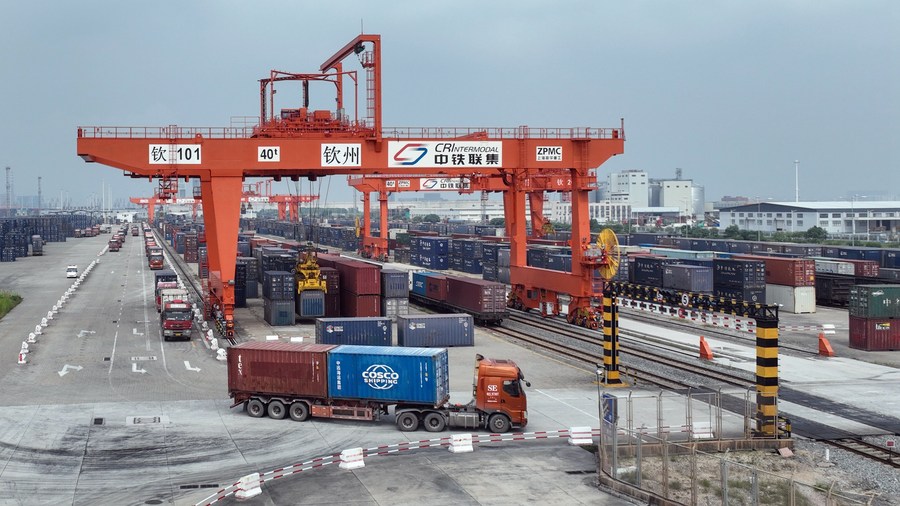 This aerial photo taken on Oct. 26, 2023 shows trains and trucks transporting containers at a railway freight yard in Qinzhou City, south China's Guangxi Zhuang Autonomous Region. (Xinhua/Zhang Ailin)