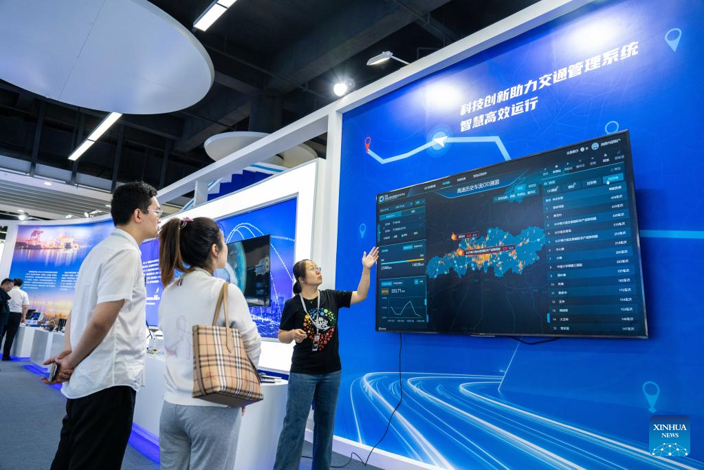 Visitors learn about the application of China's BeiDou Navigation Satellite System (BDS) on transportation management during the second International Summit on BDS Applications in Zhuzhou, central China's Hunan Province, Oct. 26, 2023. (Xinhua/Chen Sihan)