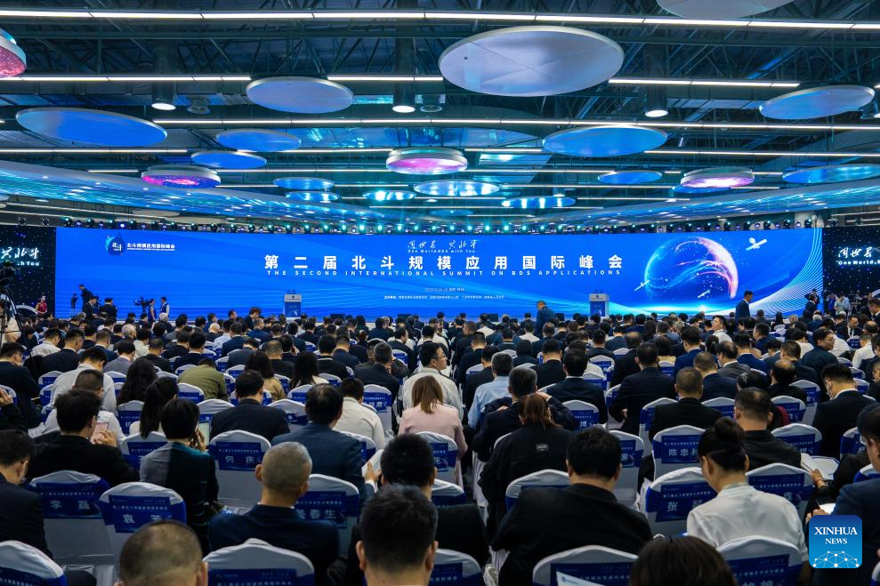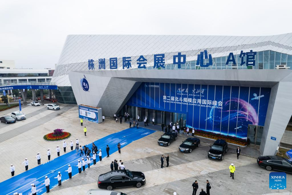 This photo taken on Oct. 26, 2023 shows the opening ceremony of the second International Summit on BeiDou Navigation Satellite System (BDS) Applications in Zhuzhou, central China's Hunan Province. (Xinhua/Chen Sihan)