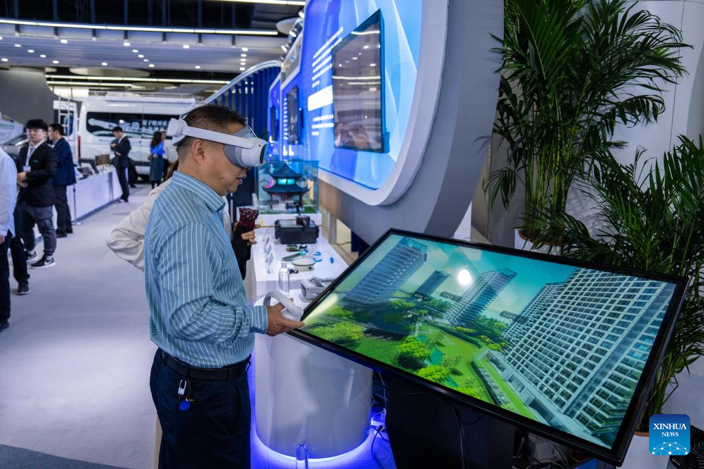 A visitor tries out a VR device with the application of China's BeiDou Navigation Satellite System (BDS) during the second International Summit on BDS Applications in Zhuzhou, central China's Hunan Province, Oct. 26, 2023. (Xinhua/Chen Sihan)