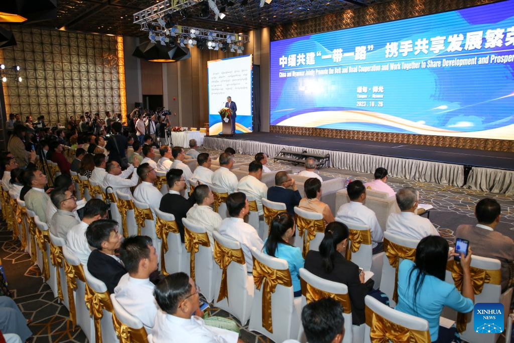 Guests from China and Myanmar attend a seminar to jointly promote the Belt and Road Cooperation between the two countries in Yangon, Myanmar, Oct. 26, 2023. The seminar held on Thursday featured discussions on China-Myanmar cooperation projects under the Belt and Road Initiative (BRI). (Photo by Myo Kyaw Soe/Xinhua)