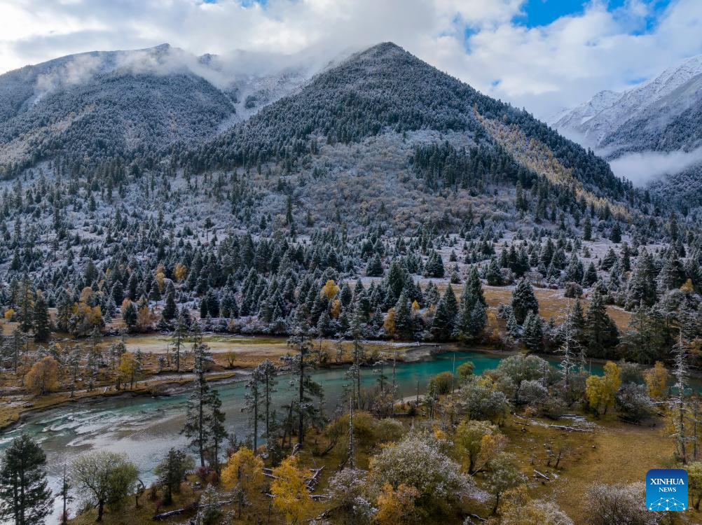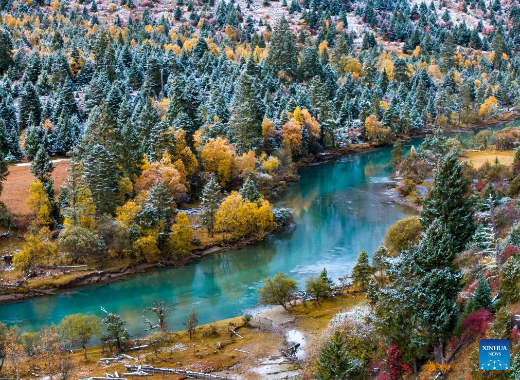 This aerial photo taken on Oct. 28, 2023 shows the autumn scenery of a canyon after a snowfall in Gongbo'Gyamda County in Nyingchi City, southwest China's Tibet Autonomous Region. (Xinhua/Jiang Fan)
