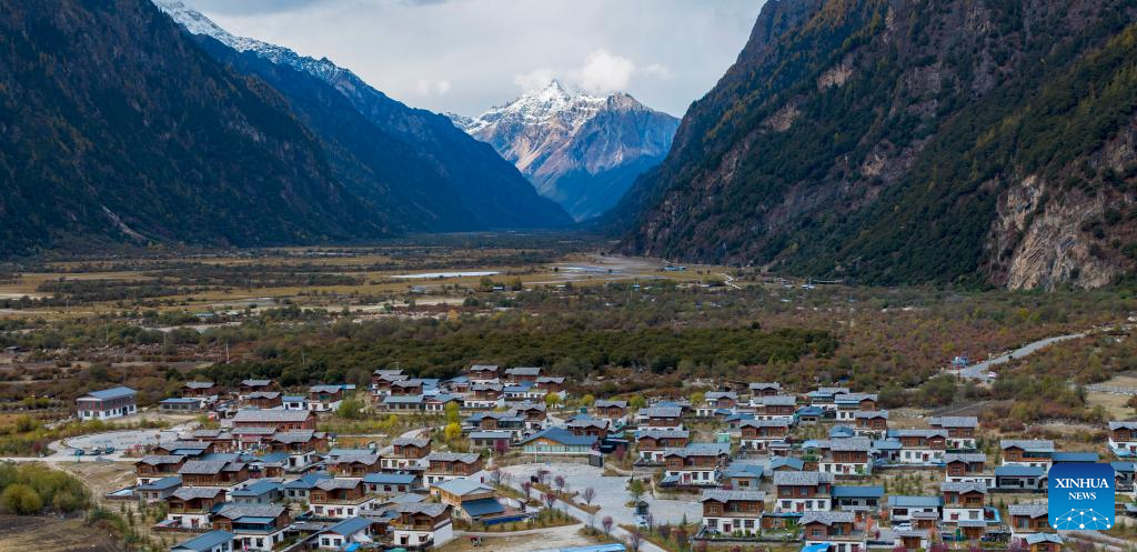 This aerial photo taken on Oct. 27, 2023 shows the autumn scenery of an ancient village in Gongbo'Gyamda County in Nyingchi City, southwest China's Tibet Autonomous Region. (Xinhua/Jiang Fan)