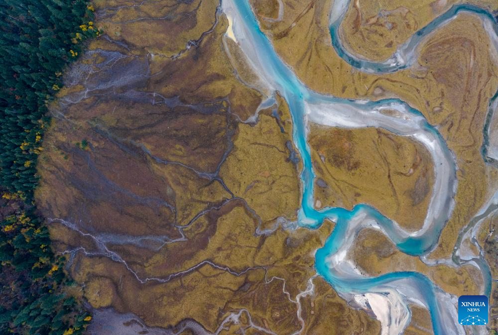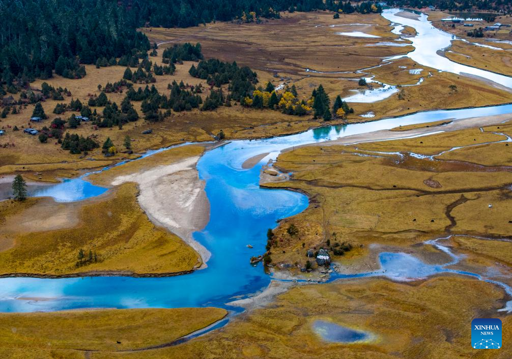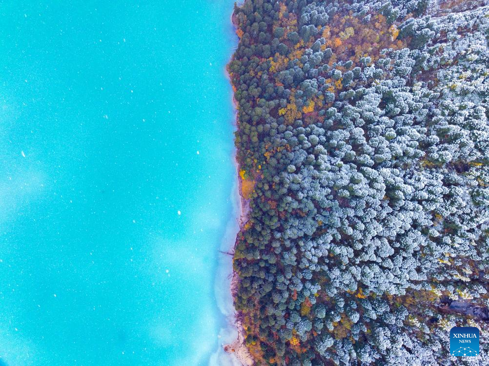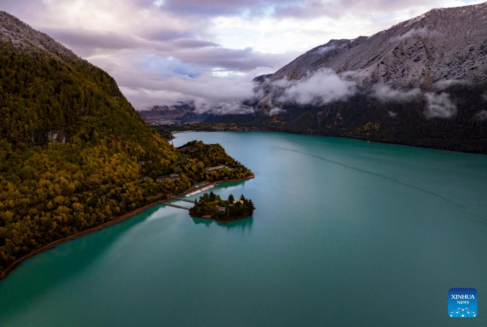 This aerial photo taken on Oct. 28, 2023 shows the autumn scenery of Basum Lake in Gongbo'Gyamda County in Nyingchi City, southwest China's Tibet Autonomous Region. (Xinhua/Jiang Fan)
