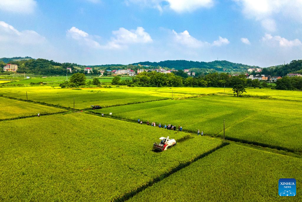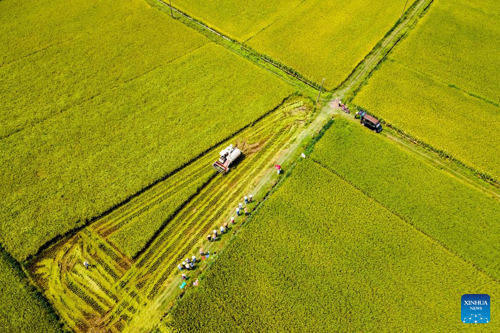 This aerial photo taken on Aug. 10, 2023 shows a farmer harvesting rice in a field in Shuangfeng County of Loudi City, central China's Hunan Province. To improve the utilization rate of farmland, Shuangfeng County is trying to experiment with a new agricultural model that enables a field to grow rice, ratoon rice and cole in different seasons of the same year. (Photo by Li Jianxin/Xinhua)
