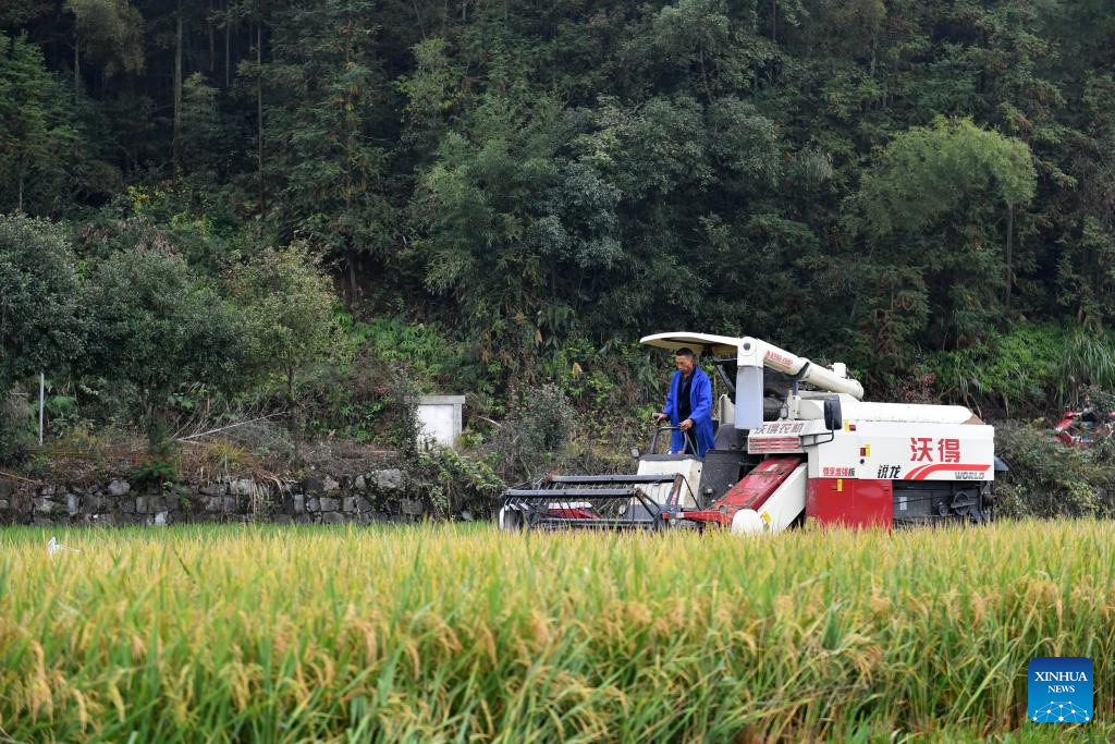 A farmer harvests ratoon rice in a field in Shuangfeng County of Loudi City, central China's Hunan Province, Oct. 28, 2023. To improve the utilization rate of farmland, Shuangfeng County is trying to experiment with a new agricultural model that enables a field to grow rice, ratoon rice and cole in different seasons of the same year. (Xinhua/Chen Zhenhai)