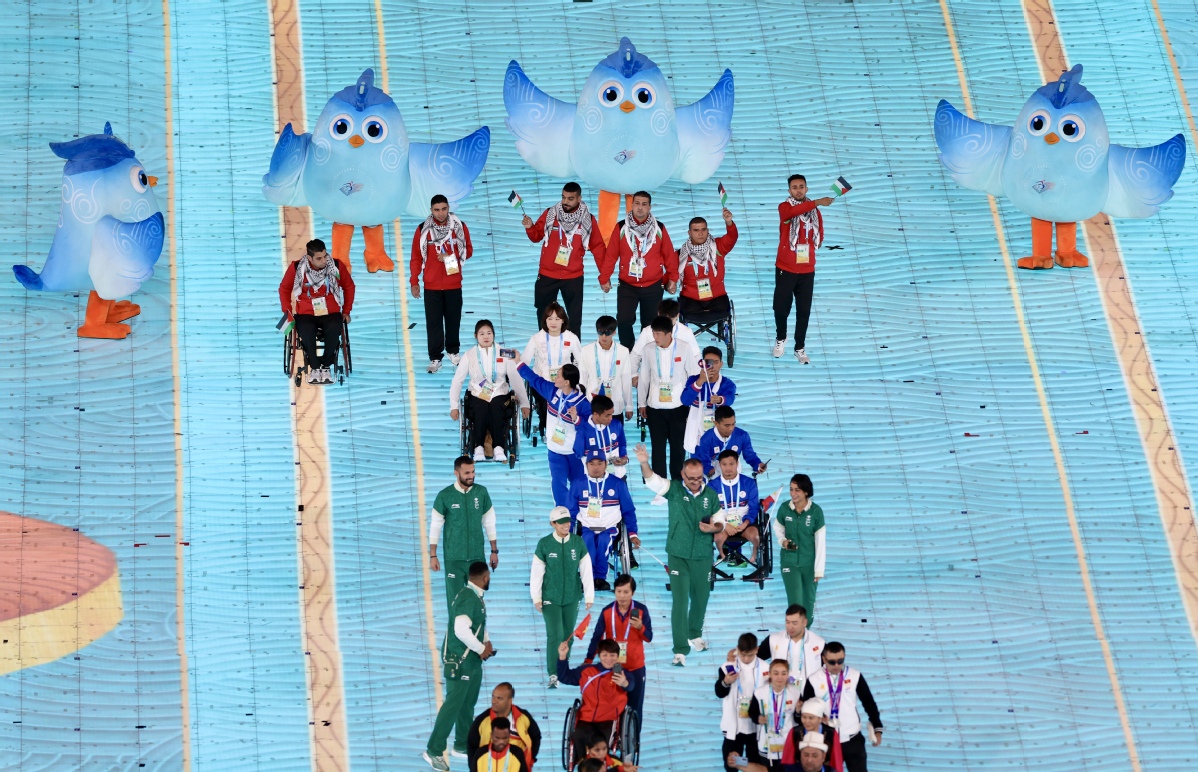 Delegation parades into the Hangzhou Olympic Sports Center Stadium during the closing ceremony of 4th Asian Para Games in Hangzhou, East China's Zhejiang province on Oct 28, 2023. [Photo by Wei Xiaohao/chinadaily.com.cn]