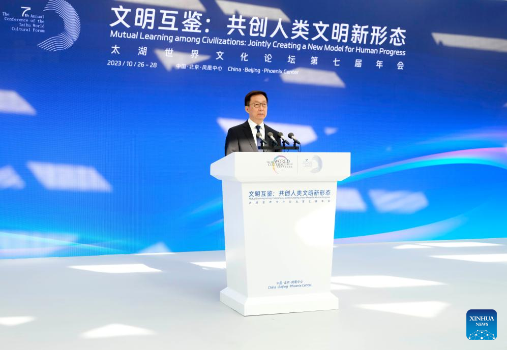 Chinese Vice President Han Zheng addresses the seventh annual conference of the Taihu World Cultural Forum in Beijing, capital of China, Oct. 27, 2023. (Xinhua/Ding Lin)