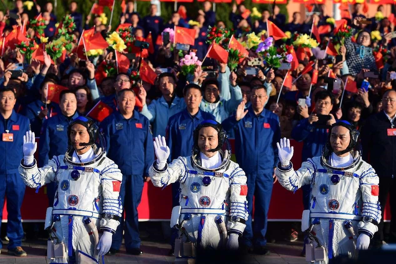 Chinese astronauts Tang Hongbo (R), Tang Shengjie (C) and Jiang Xinlin attend a see-off ceremony at the Jiuquan Satellite Launch Center in northwest China on Oct. 26, 2023. (People's Daily Online/Wang Xiaobo)