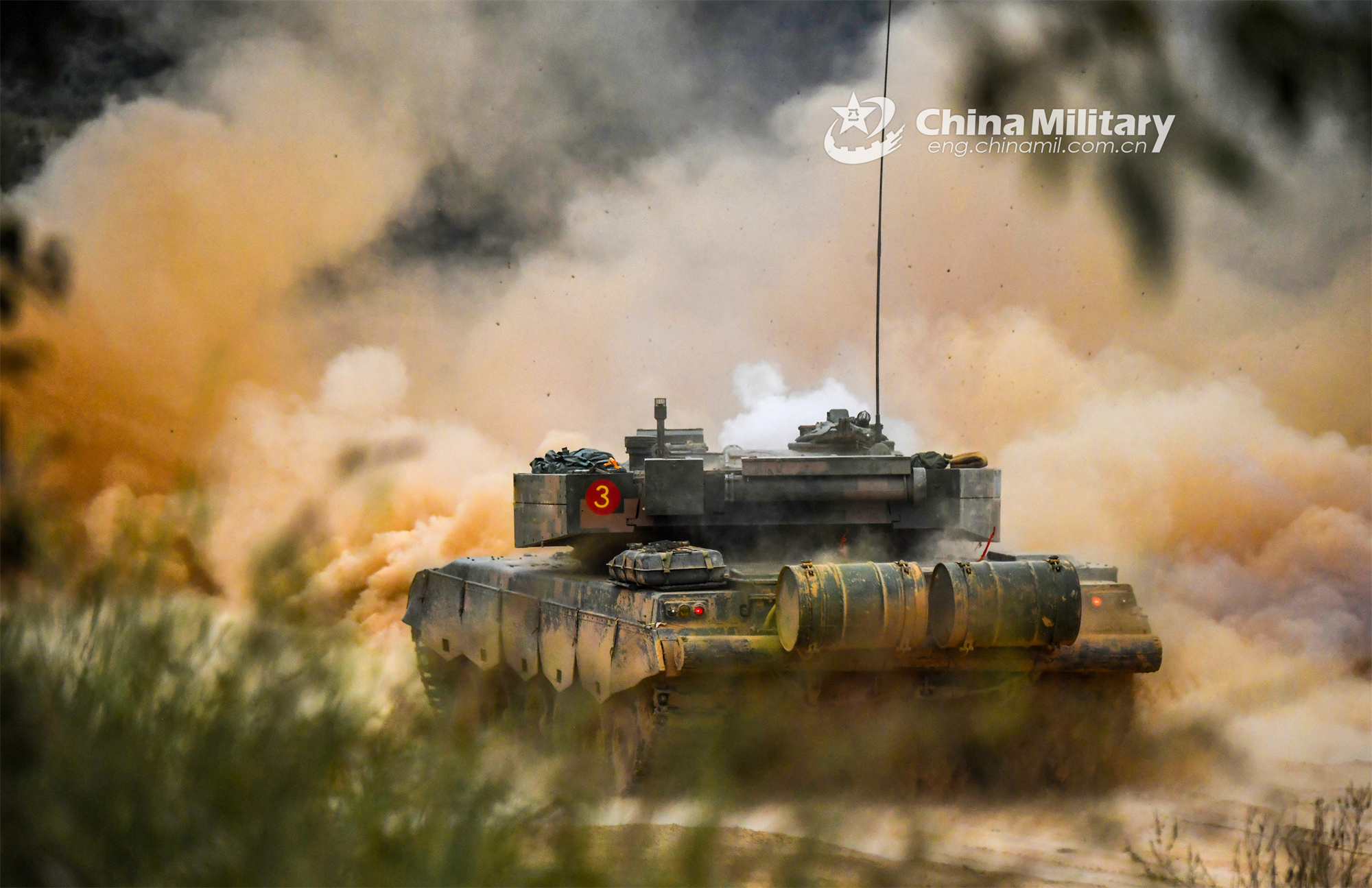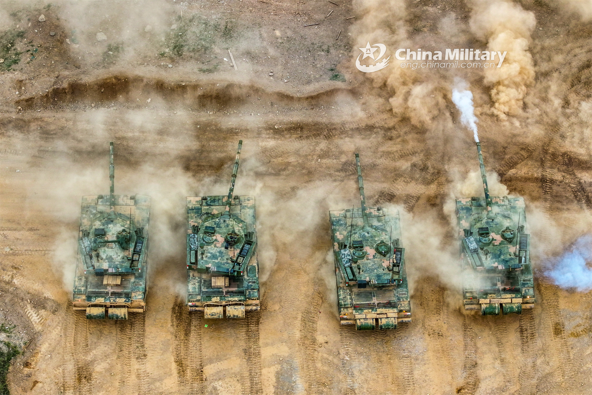 A main battle tank attached to an Army brigade under the PLA Eastern Theater Command kicks up plumes of dust en route to a designated area during live-fire training on October 12, 2023. (eng.chinamil.com.cn/Photo by Liu Zhiyong)