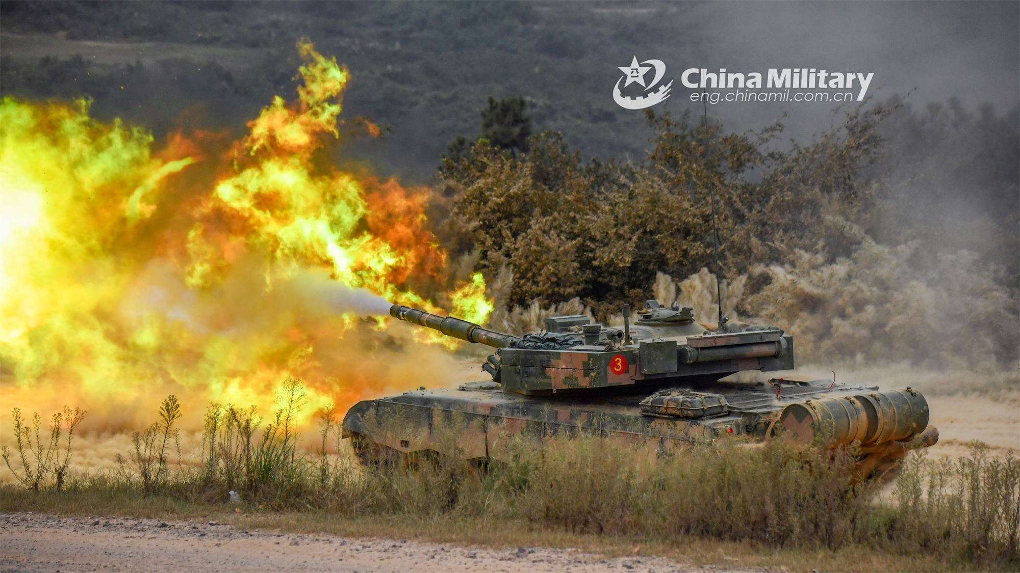 A main battle tank attached to an Army brigade under the PLA Eastern Theater Command fires its main weapon during live-fire training on October 12, 2023.? (eng.chinamil.com.cn/Photo by Liu Zhiyong)