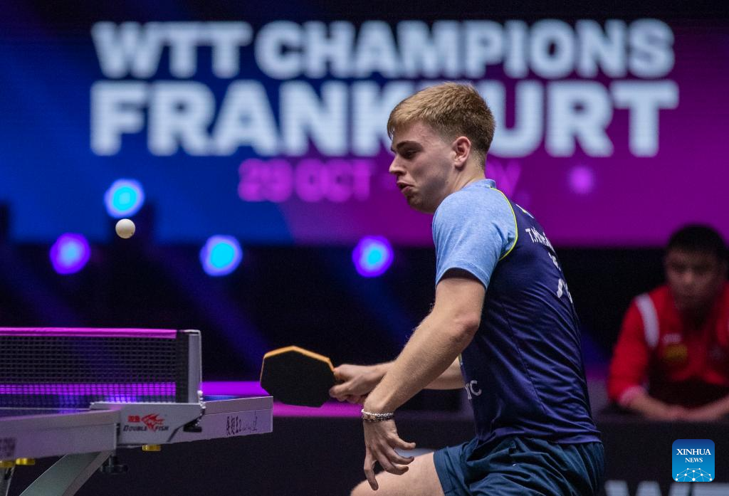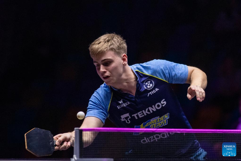 Truls Moregard of Sweden hits a return during the men's singles round of 32 match against Fan Zhendong of China at the WTT Champions Frankfurt 2023 in Frankfurt, Germany, Oct. 29, 2023. (Xinhua/Zhang Fan)