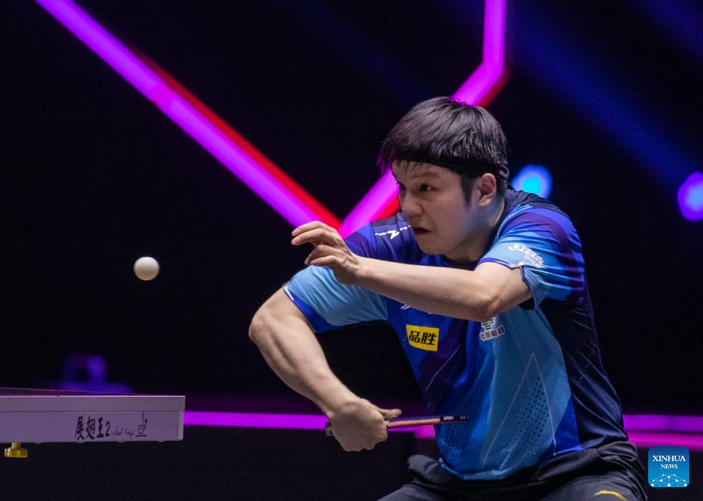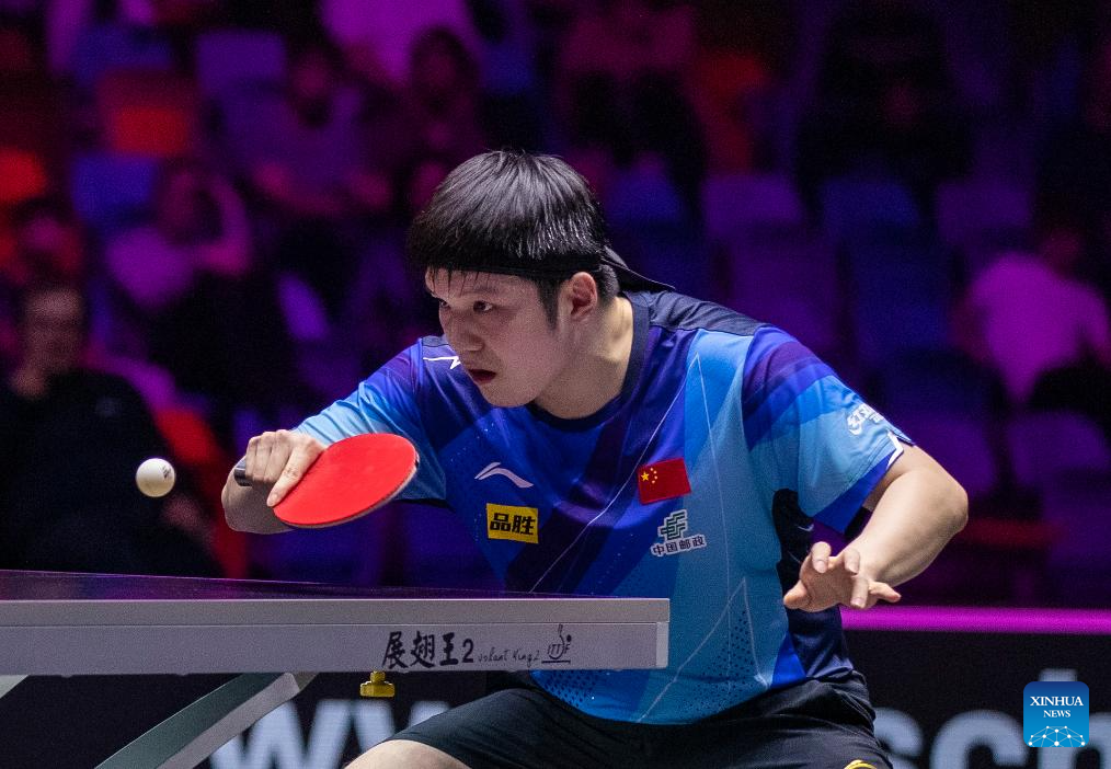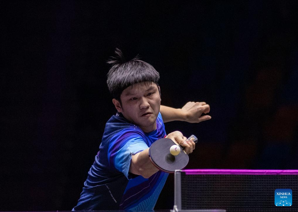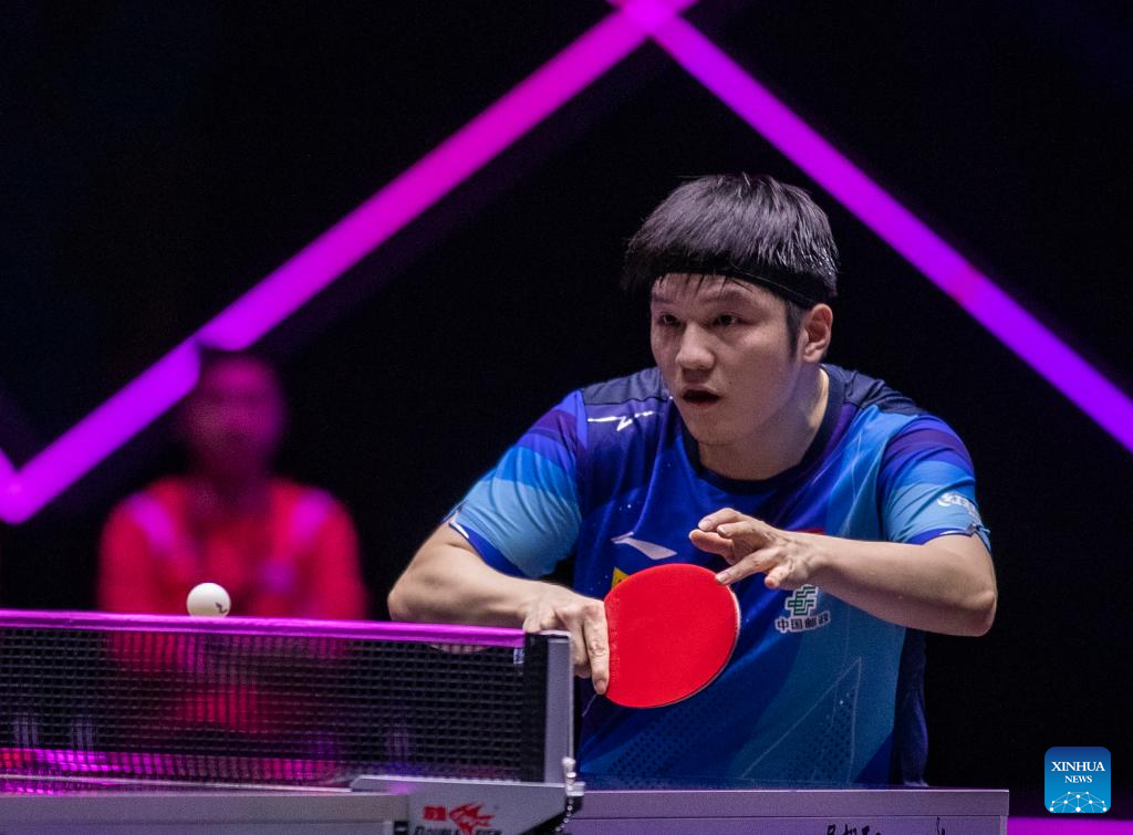 Fan Zhendong of China hits a return during the men's singles round of 32 match against Truls Moregard of Sweden at the WTT Champions Frankfurt 2023 in Frankfurt, Germany, Oct. 29, 2023. (Xinhua/Zhang Fan)