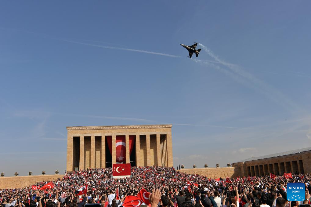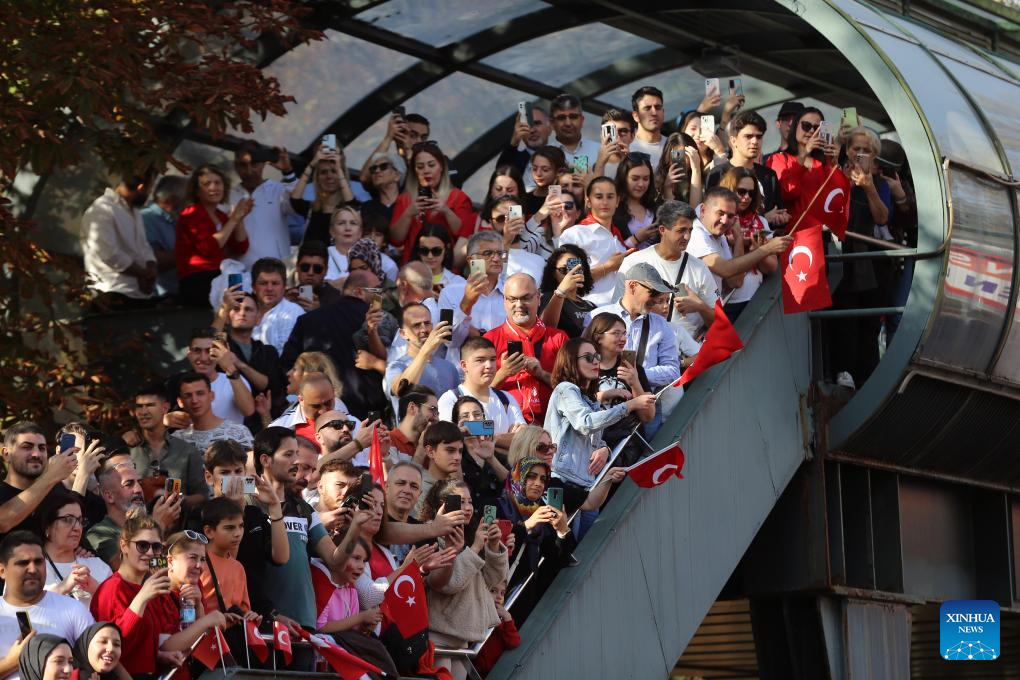 People watch celebrations marking the 100th anniversary of the establishment of the Republic of Trkiye in Ankara, Trkiye, Oct. 29, 2023. (Mustafa Kaya/Handout via Xinhua)