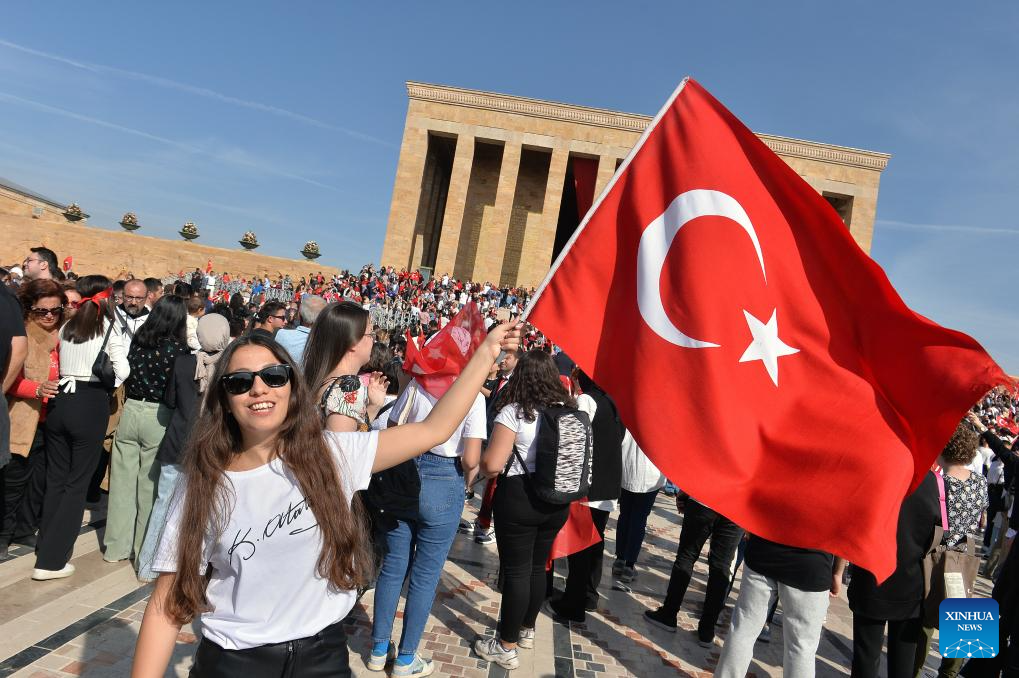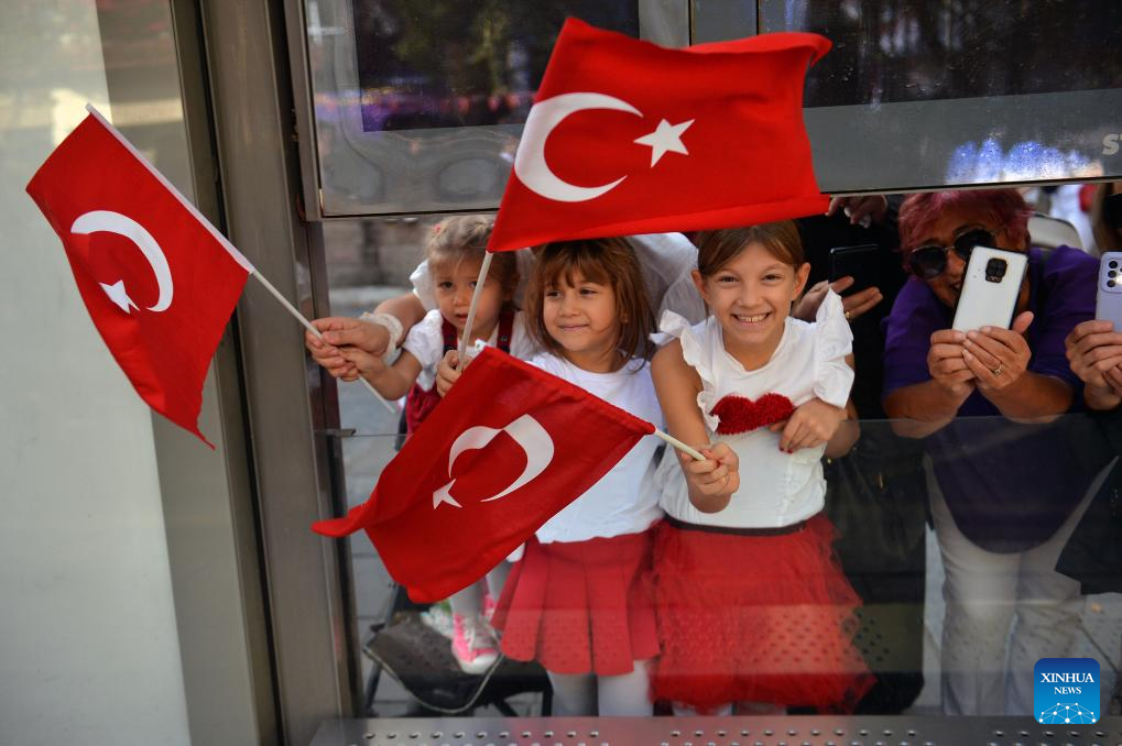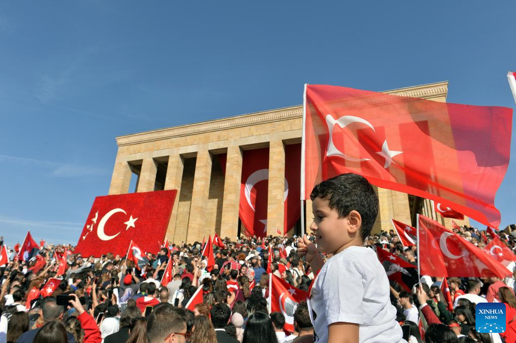 People participate in celebrations marking the 100th anniversary of the establishment of the Republic of Trkiye in Ankara, Trkiye, Oct. 29, 2023. (Mustafa Kaya/Handout via Xinhua)