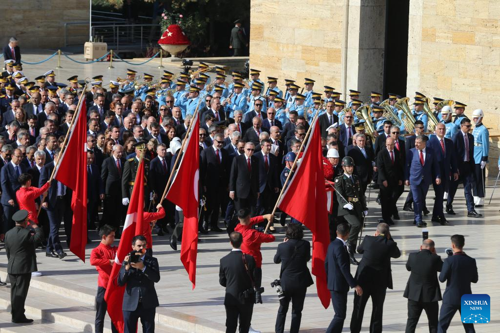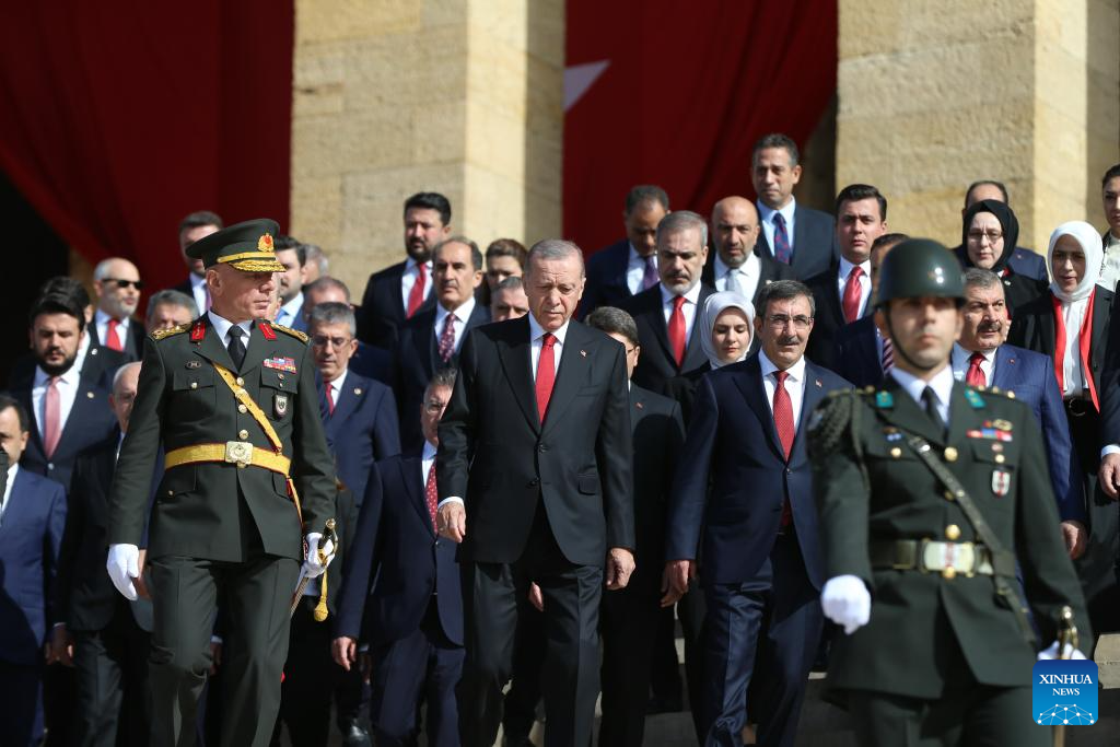 Turkish President Recep Tayyip Erdogan (C) visits Anitkabir, the mausoleum of the founder of Turkish Republic Mustafa Kemal Ataturk, during celebrations marking the 100th anniversary of the establishment of the Republic of Trkiye in Ankara, Trkiye, Oct. 29, 2023. (Mustafa Kaya/Handout via Xinhua)