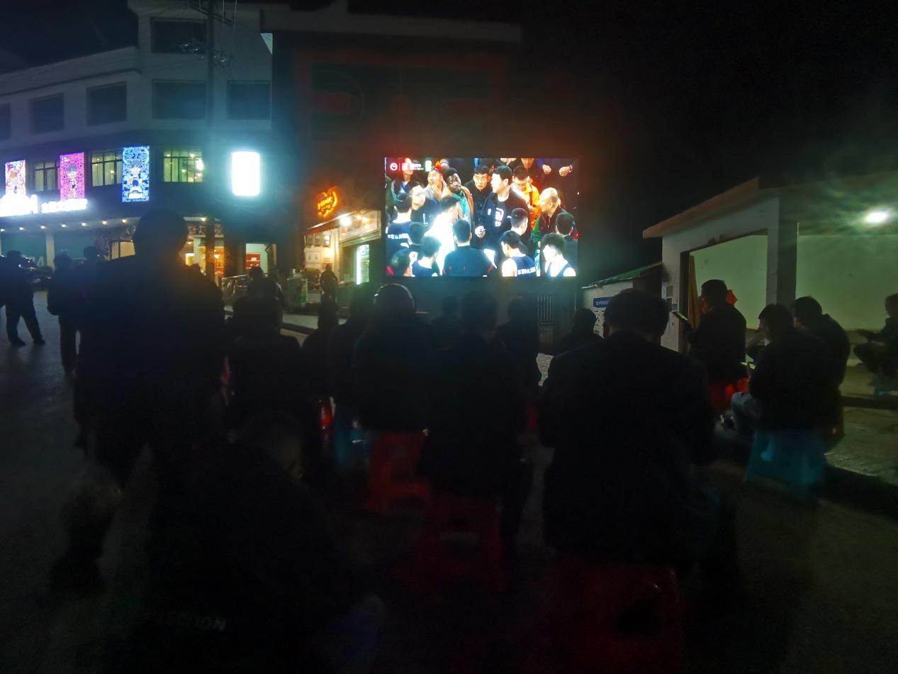 People watch the Village BA game live on a street in Taipan village, Taijiang county, southwest China's Guizhou Province, Oct. 28, 2023. (People's Daily Online/Zhang Kaiwei)