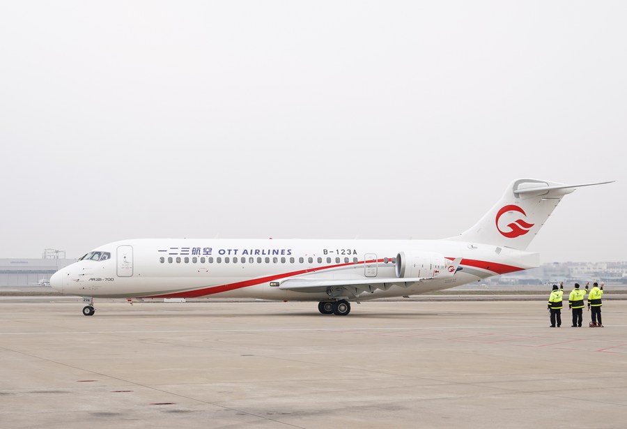 An ARJ21 jetliner of One Two Three Airlines (OTT Airlines) heads for designated area before performing its first flight at Shanghai Hongqiao International Airport in Shanghai, east China, Dec. 28, 2020. (Xinhua/Ding Ting)