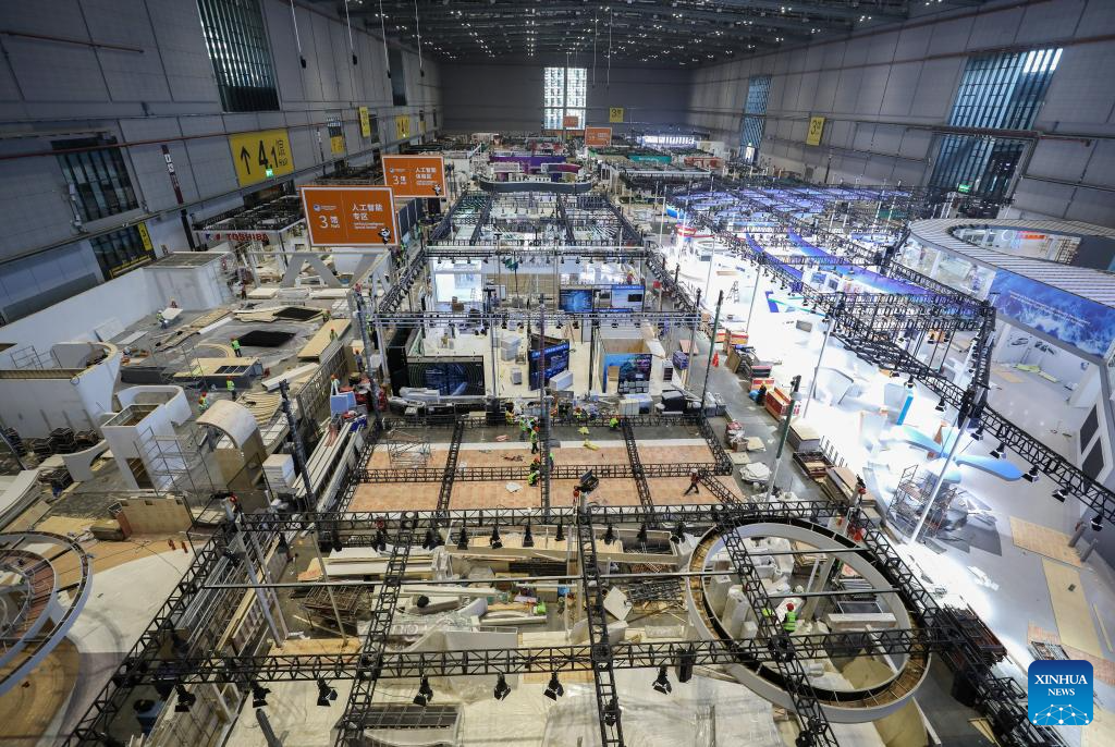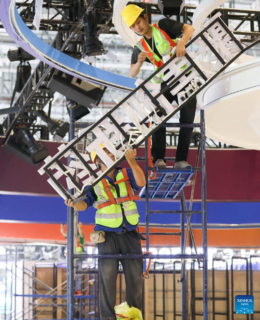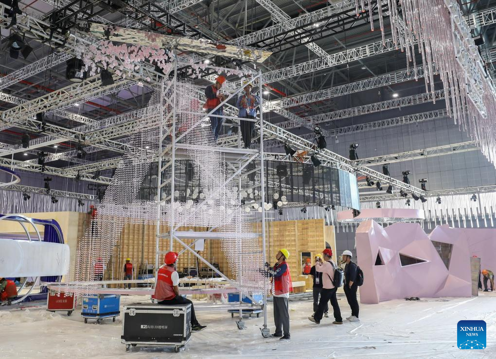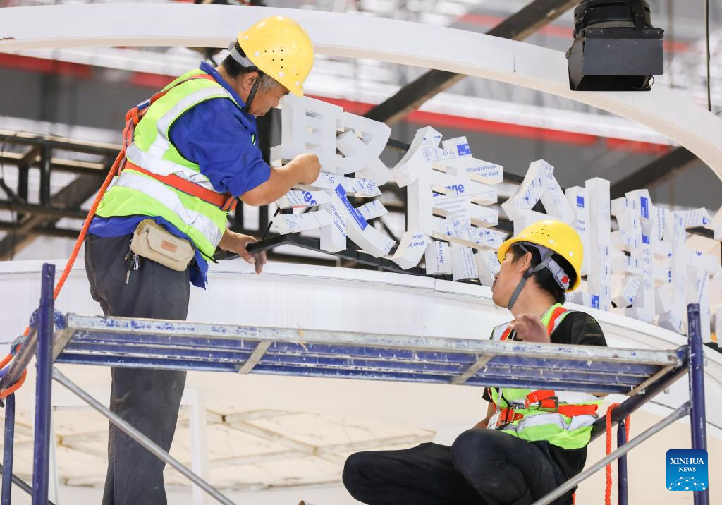 Workers set up an exhibition area at the National Exhibition and Convention Center (Shanghai), the main venue for the upcoming sixth China International Import Expo (CIIE), in east China's Shanghai, Oct. 29, 2023. The sixth CIIE is scheduled to take place in Shanghai from Nov. 5 to Nov. 10. (Xinhua/Ding Ting)