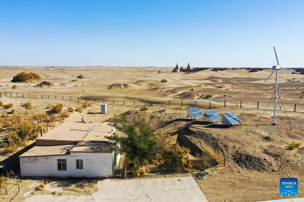 This aerial photo taken on Oct. 27, 2023 shows bungalows built by Su He and Delg near the Heicheng relic site in Ejina Banner of Alxa League, north China's Inner Mongolia Autonomous Region. (Xinhua/Lian Zhen)