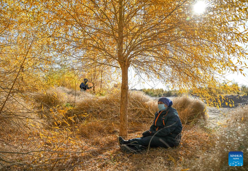 Delg patrols in the Haloxylon forest in Ejina Banner of Alxa League, north China's Inner Mongolia Autonomous Region, Oct. 27, 2023.