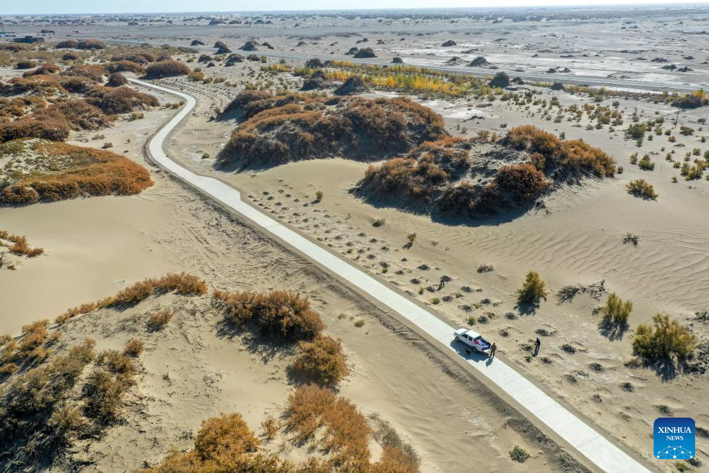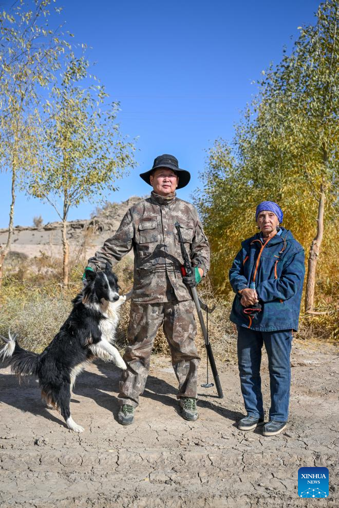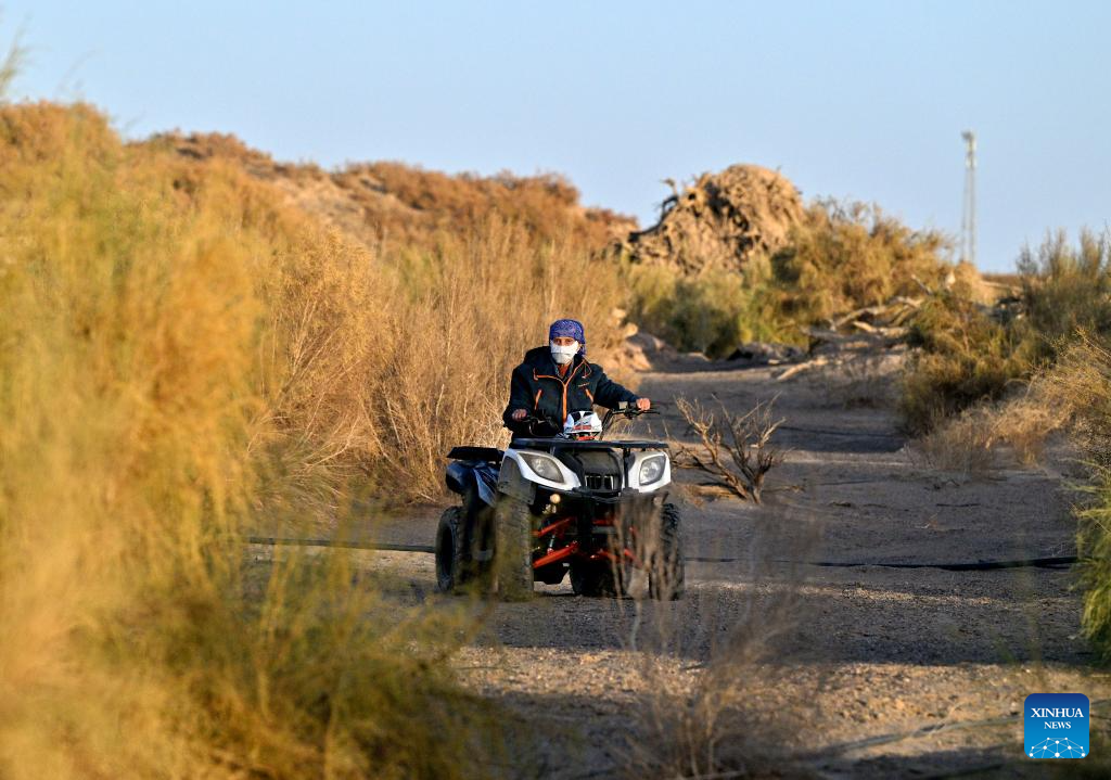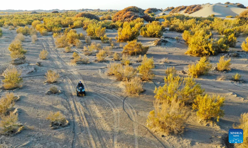 Delg patrols in the Haloxylon forest in Ejina Banner of Alxa League, north China's Inner Mongolia Autonomous Region, Oct. 27, 2023. (Xinhua/Ren Junchuan)