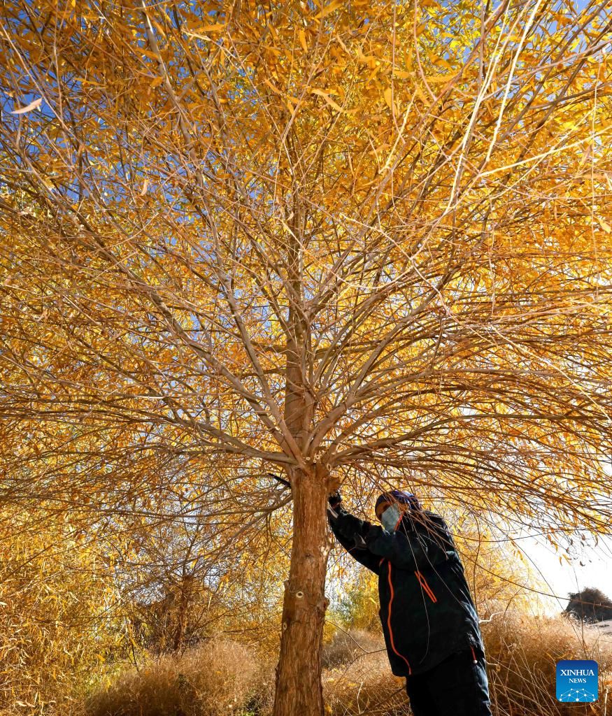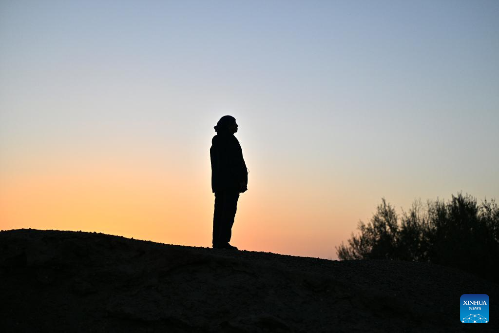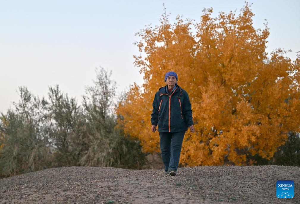 Delg walks beside the Haloxylon forest in Ejina Banner of Alxa League, north China's Inner Mongolia Autonomous Region, Oct. 27, 2023. (Xinhua/Ren Junchuan)