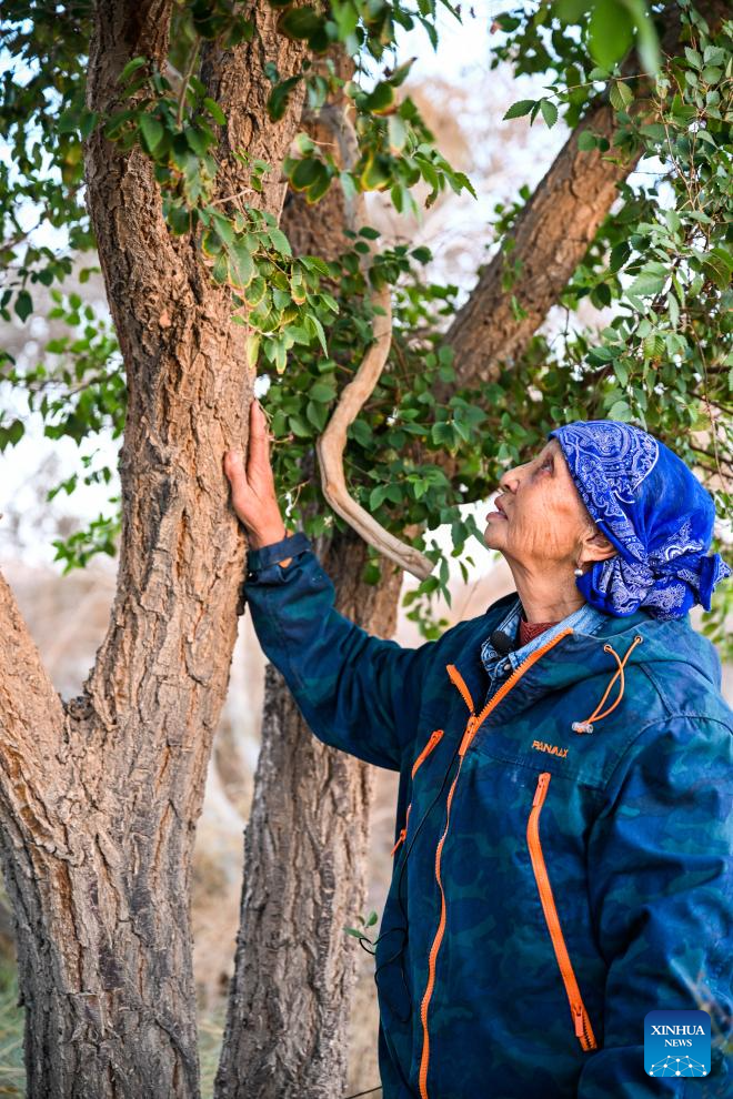 Delg touches the first tree she and her husband Su He planted in Ejina Banner of Alxa League, north China's Inner Mongolia Autonomous Region, Oct. 27, 2023. (Xinhua/Liu Jinhai)