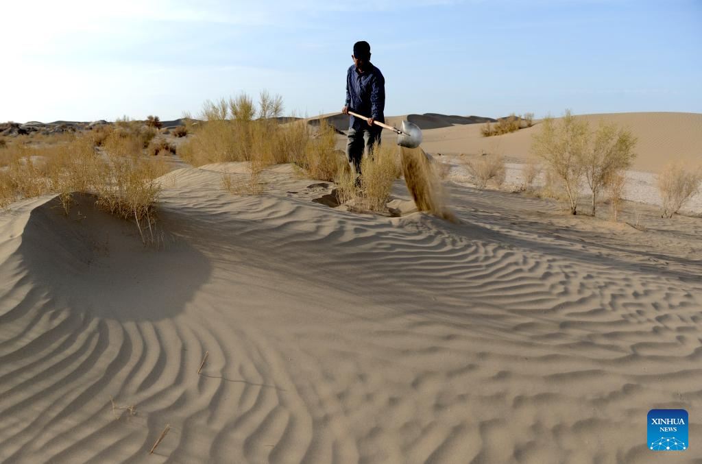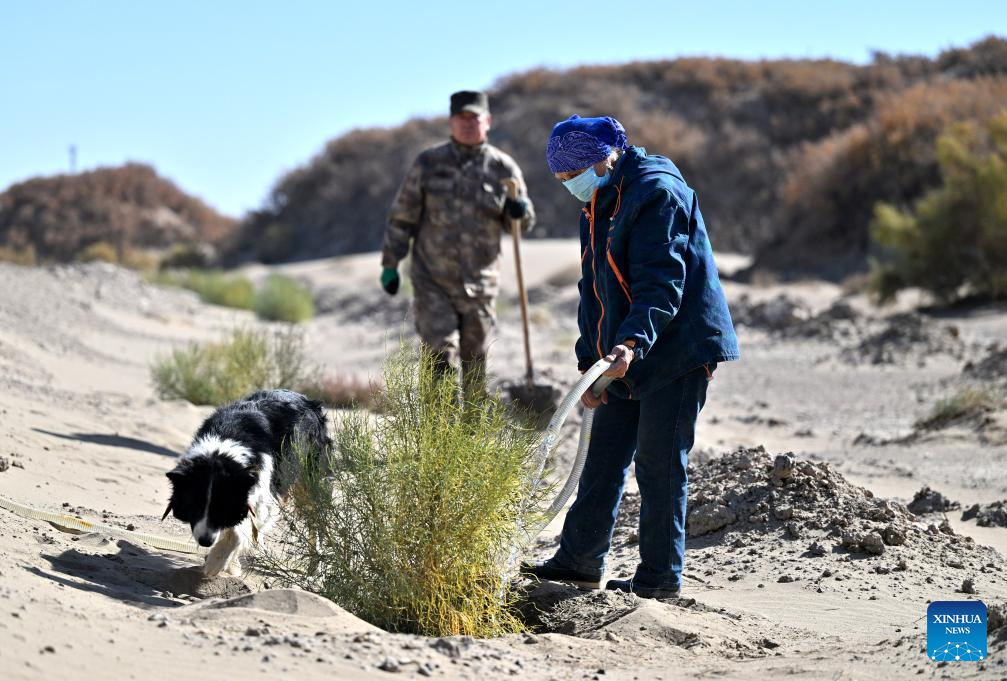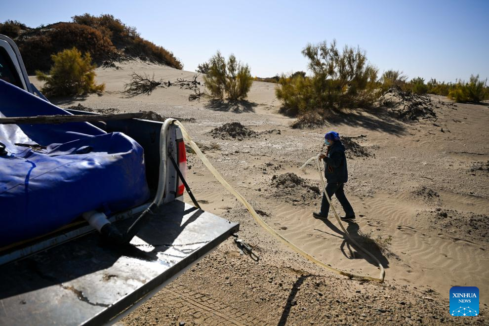 Delg waters Haloxylon plants in Ejina Banner of Alxa League, north China's Inner Mongolia Autonomous Region, Oct. 28, 2023. (Xinhua/Liu Jinhai)