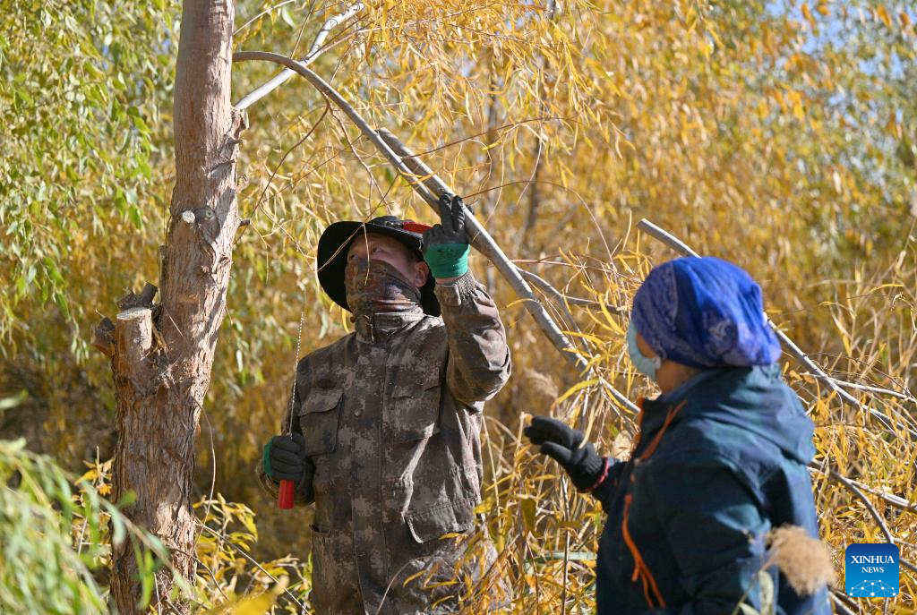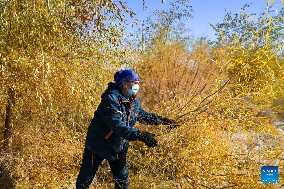 Delg arranges Haloxylon branches she cut off while pruning in Ejina Banner of Alxa League, north China's Inner Mongolia Autonomous Region, Oct. 28, 2023. (Xinhua/Liu Jinhai)