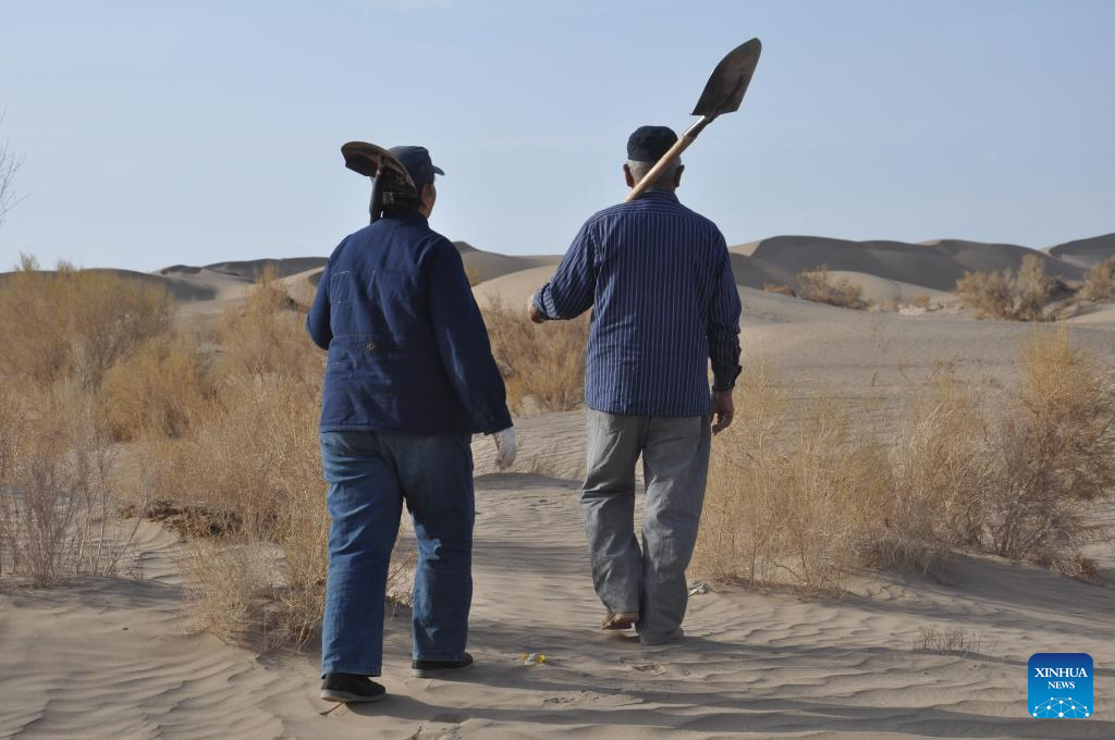 Delg (R) and her son prune a Haloxylon plant in Ejina Banner of Alxa League, north China's Inner Mongolia Autonomous Region, Oct. 28, 2023. (Xinhua/Ren Junchuan)