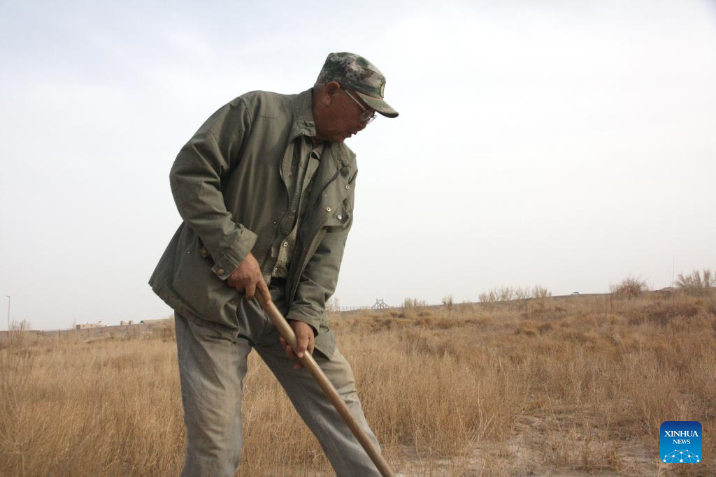 Delg prunes a Haloxylon plant in Ejina Banner of Alxa League, north China's Inner Mongolia Autonomous Region, Oct. 28, 2023. (Xinhua/Liu Jinhai)