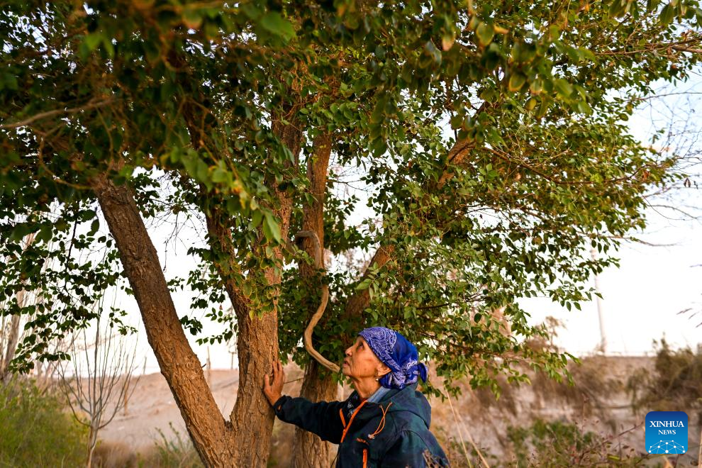 Delg touches the first tree she and her husband Su He planted in Ejina Banner of Alxa League, north China's Inner Mongolia Autonomous Region, Oct. 27, 2023. (Xinhua/Lian Zhen)